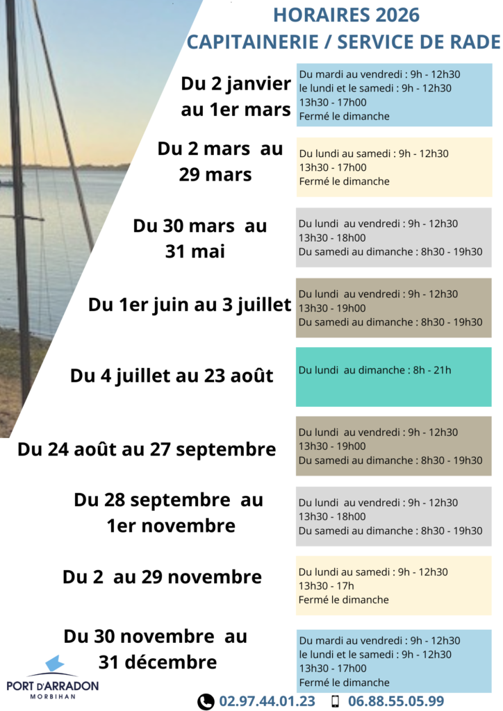 Le port de plaisance de Arradon est situé dans le Morbihan. Il dispose d’une capacité d’accueil de 119 bateaux sur pontons. Il peut accueillir 211 bateaux sur corps mort. Le port est réservé aux bateaux de moins de 7 m. Attention, le tirant d’eau maximum est de 6 m.